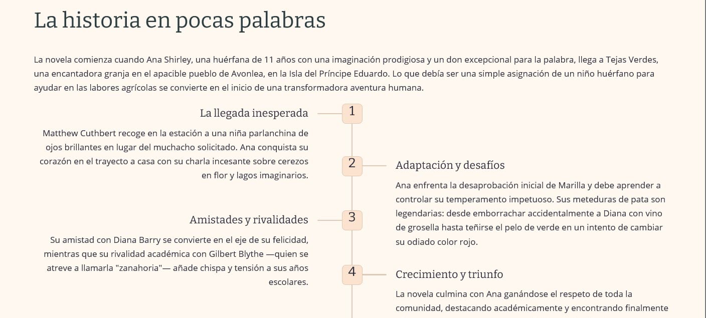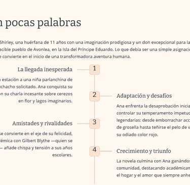 Ana la de Tejas Verdes es una novela clásica que narra la llegada de Ana Shirley, una niña huérfana imaginativa y apasionada, al hogar de los hermanos Cuthbert en Avonlea. La historia mezcla humor, sensibilidad y aventuras cotidianas que muestran el poder de la imaginación y la importancia de sentirse aceptado.
