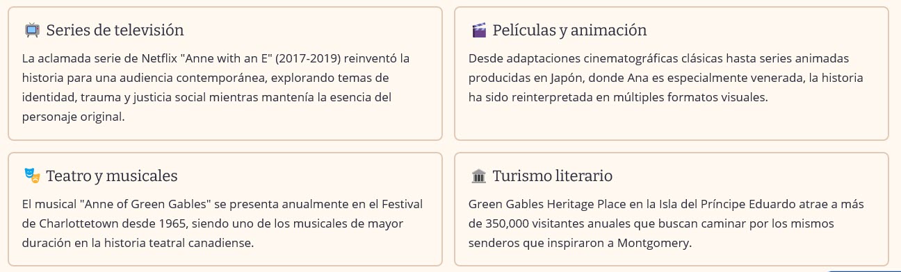 La novela ha dejado una huella duradera en la literatura infantil y juvenil, inspirando adaptaciones televisivas, teatrales y cinematográficas en distintos países. Su protagonista, Ana Shirley, se ha convertido en un símbolo de creatividad, resiliencia y autenticidad, conectando con lectores de distintas épocas y culturas.