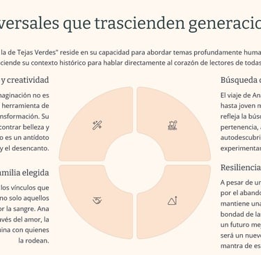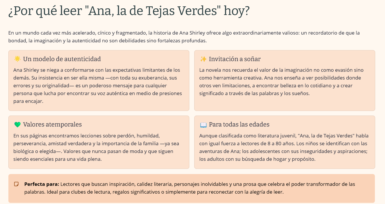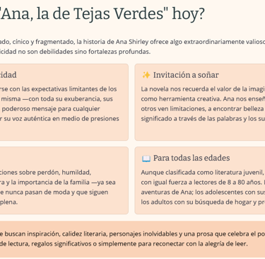 Ana la de Tejas Verdes es una novela clásica que narra la llegada de Ana Shirley, una niña huérfana imaginativa y apasionada, al hogar de los hermanos Cuthbert en Avonlea. La historia mezcla humor, sensibilidad y aventuras cotidianas que muestran el poder de la imaginación y la importancia de sentirse aceptado.