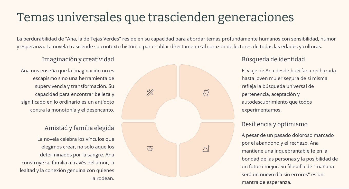 Ana transforma lo ordinario en extraordinario: los árboles tienen nombres, los lagos son "aguas resplandecientes", y cada rincón de Avonlea cobra vida en su mente creativa. Su energía desbordante y su forma única de ver el mundo revolucionan la tranquila vida de la comunidad.